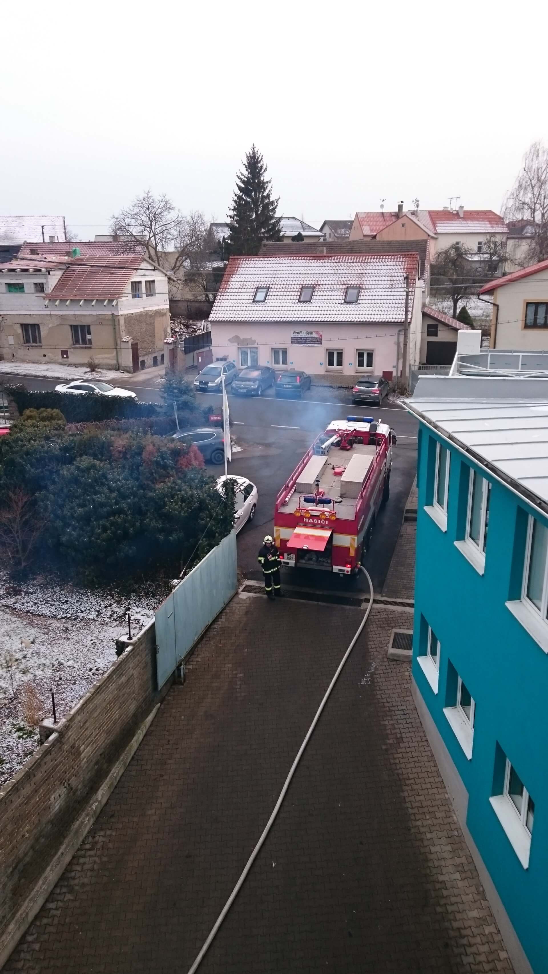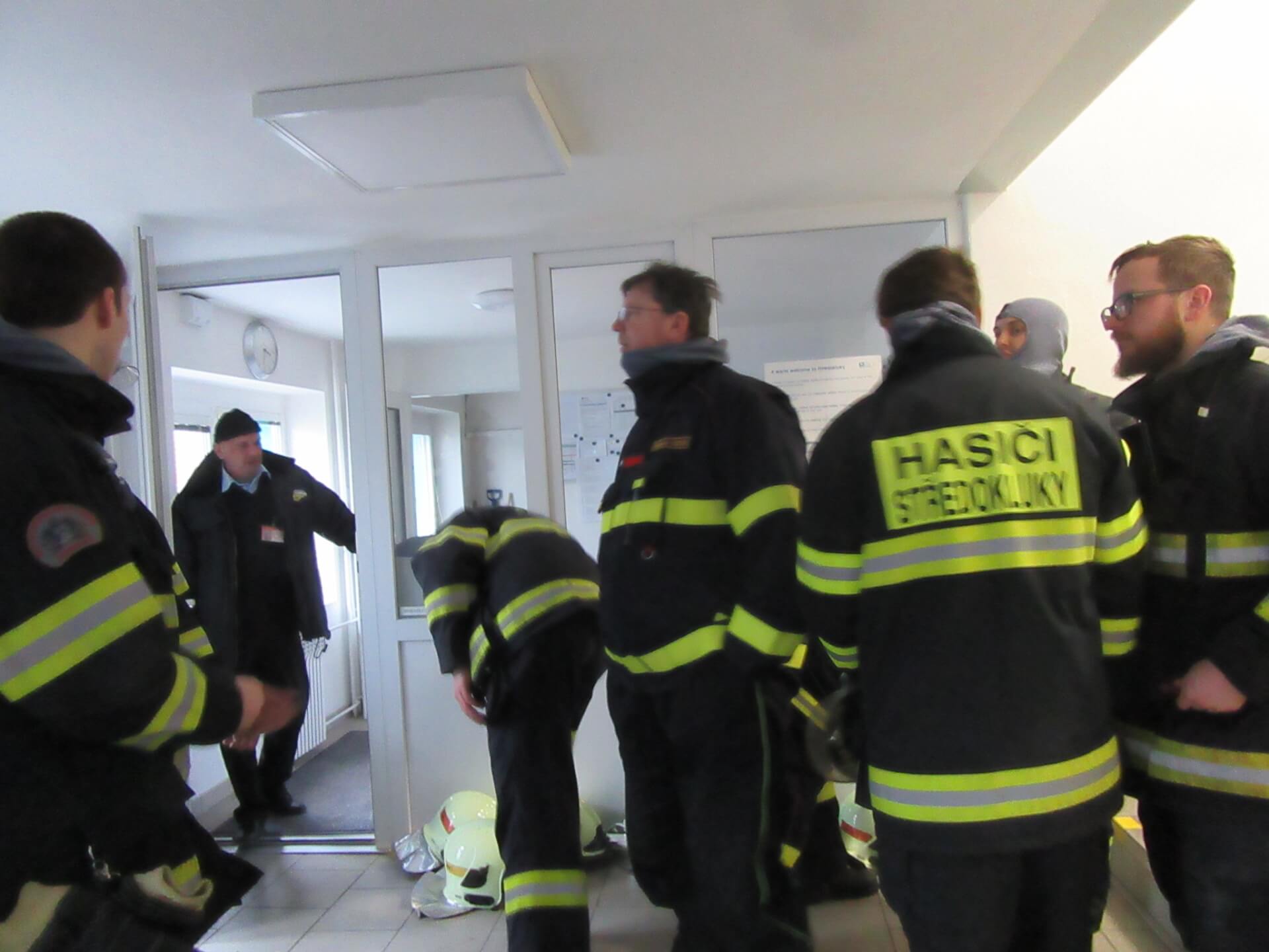 Po ukončení prohlídky se velitel jednotky a velitelé družstev seznámili s poplachovým plánem a dokumentací pro zdolávání požáru, dokumentaci na recepci předvedl za přítomnosti pana Karfíka službu konající člen ochranky.