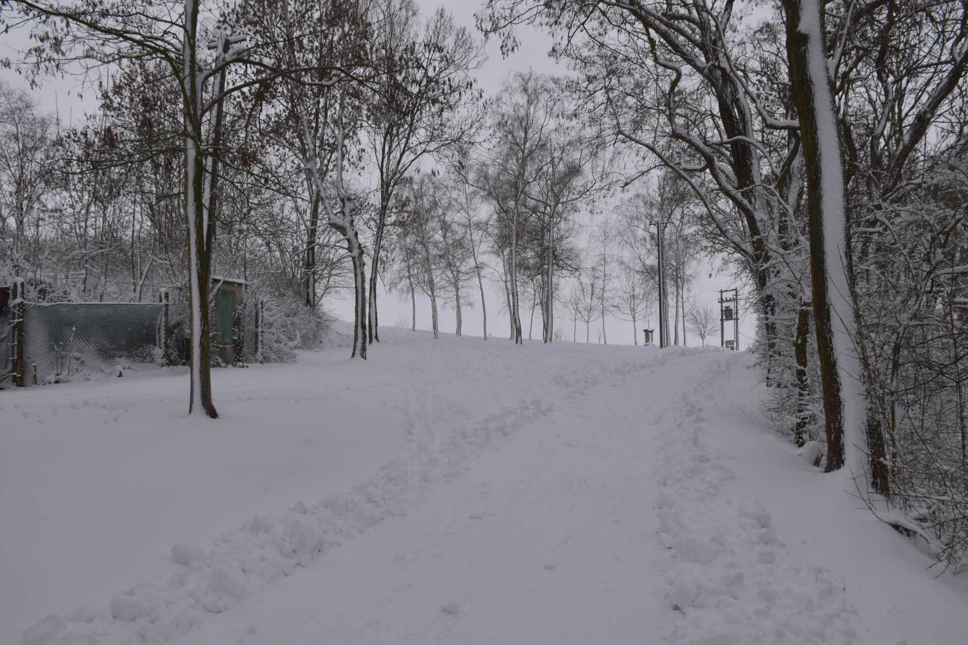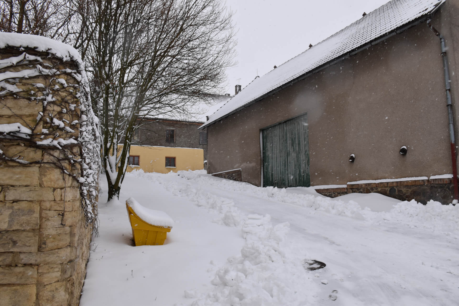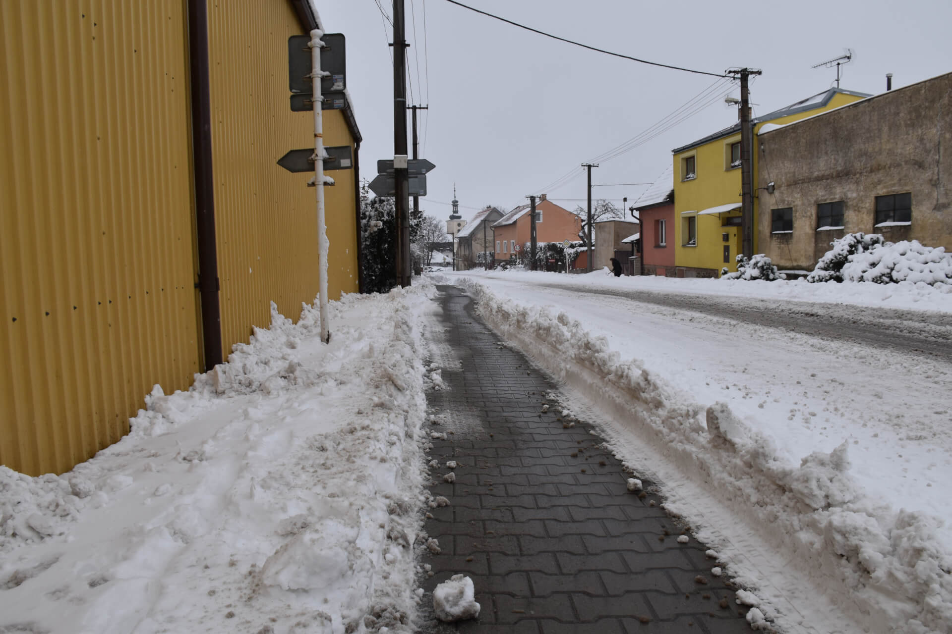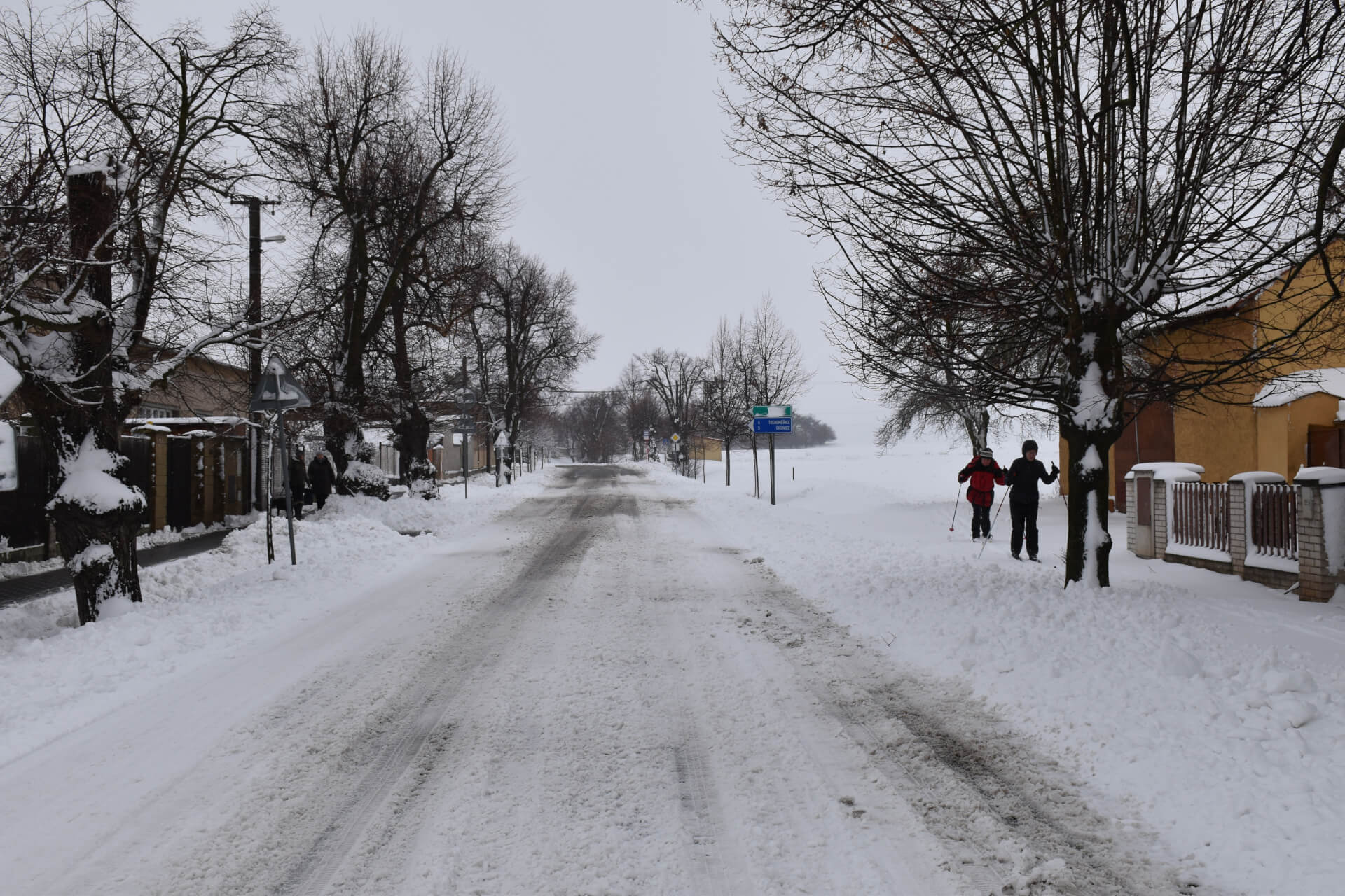 Všechny prudší svahy v obci jsou opatřeny žlutými nádobami na posypový materiál. Pokud máte pocit, že není úsek bezpečný, neváhejte si jej posypat.