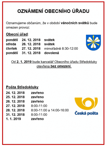 OZNÁMENÍ OBECNÍHO ÚŘADU Oznamujeme občanům, že v období vánočních svátků bude omezen provoz: Obecní úřad: pondělí 24. 12. 2018 svátek úterý 25. 12. 2018 svátek středa 26. 12. 2018 svátek čtvrtek 27. 12. […]
