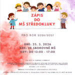 Mateřská škola Středokluky p.o. vyhlašuje ZÁPIS pro rok 2026/2027 25. 3. 2026.  13-17 hod. ve sborovně MŠ Co vzít k zápisu s sebou? řádně vyplněnou žádost o přijetí včetně potvrzení od lékaře rodný list dítěte průkaz totožnosti zákonného zástupce cizinci předloží povolení k trvalému pobytu na dobu delší než 90 dnů Dotazy zodpoví…