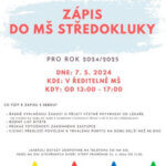 Mateřská škola Středokluky p.o. vyhlašuje zápis do MŠ pro rok 2024/2025. 7.5.2024 v ředitelně MŠ od 13:00 – 17:00 hodin řádně vyplněnou žádost o přijetí včetně potvrzení od lékaře rodný list dítěte průkaz totožnosti zákonného zástupce cizinci předloží povolení k pobytu na dobu delší než 90 dnů Jakékoliv dotazy…
