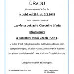 Z důvodu dovolené bude omezen provoz obecního úřadu ve dnech 20.-24. února 2017, mimo provoz: Czech POINT (výpisy z katastru nemovitostí, veřejných i neveřejných rejstříků, apod.) Pokladna Ověřování podpisů a listin Přihlašování k trvalému pobytu Podatelna dle předchozí domluvy. Děkujeme za pochopení.