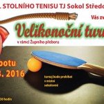 Oddíl stolního tenisu TJ Sokol Středokluky vás zve na Velikonoční turnaj v rámci Župního přeboru ve stolním tenise. Turnaj je vypsán pro amatéry a hráče okresních přeborů. Zápis: 8:00 – 8:15 žáci 9:00-9:30 dospělí Startovné: žáci: 30 Kč dospělí dvouhra: 70 Kč dospělí čtyřhra: 30 Kč