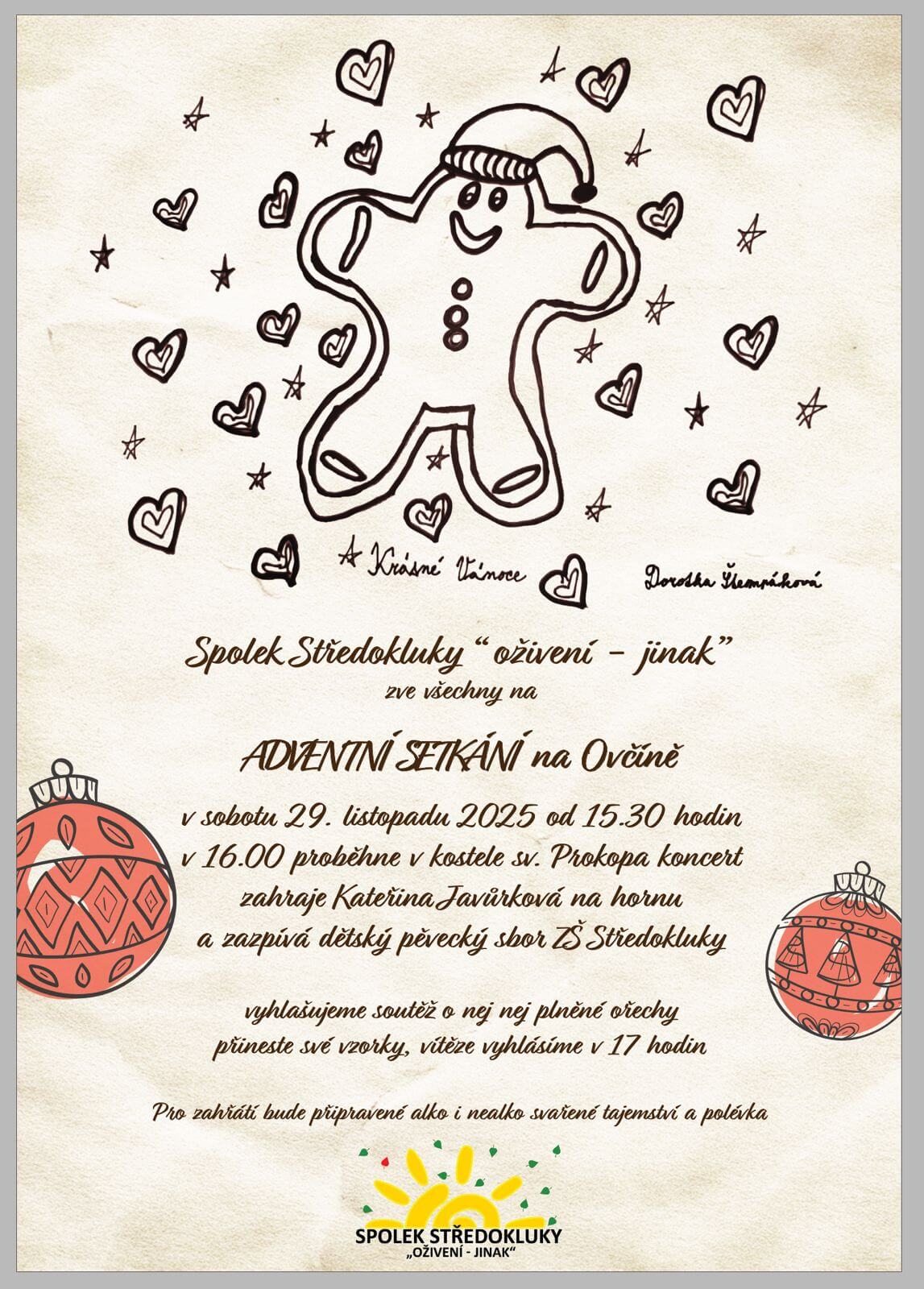 Spolek Středokluky „oživení-jinak“ zve na adventní setkání Na Ovčíně od 15.30 hodin a zároveň zve na koncert v kostele Sv. Prokopa od 16.00 hodin.