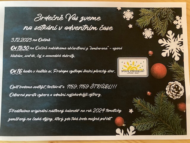 Spolek Středokluky „Oživení-jinak“ zve na setkání v adventním čase 3.12. 2023 na Ovčíně.