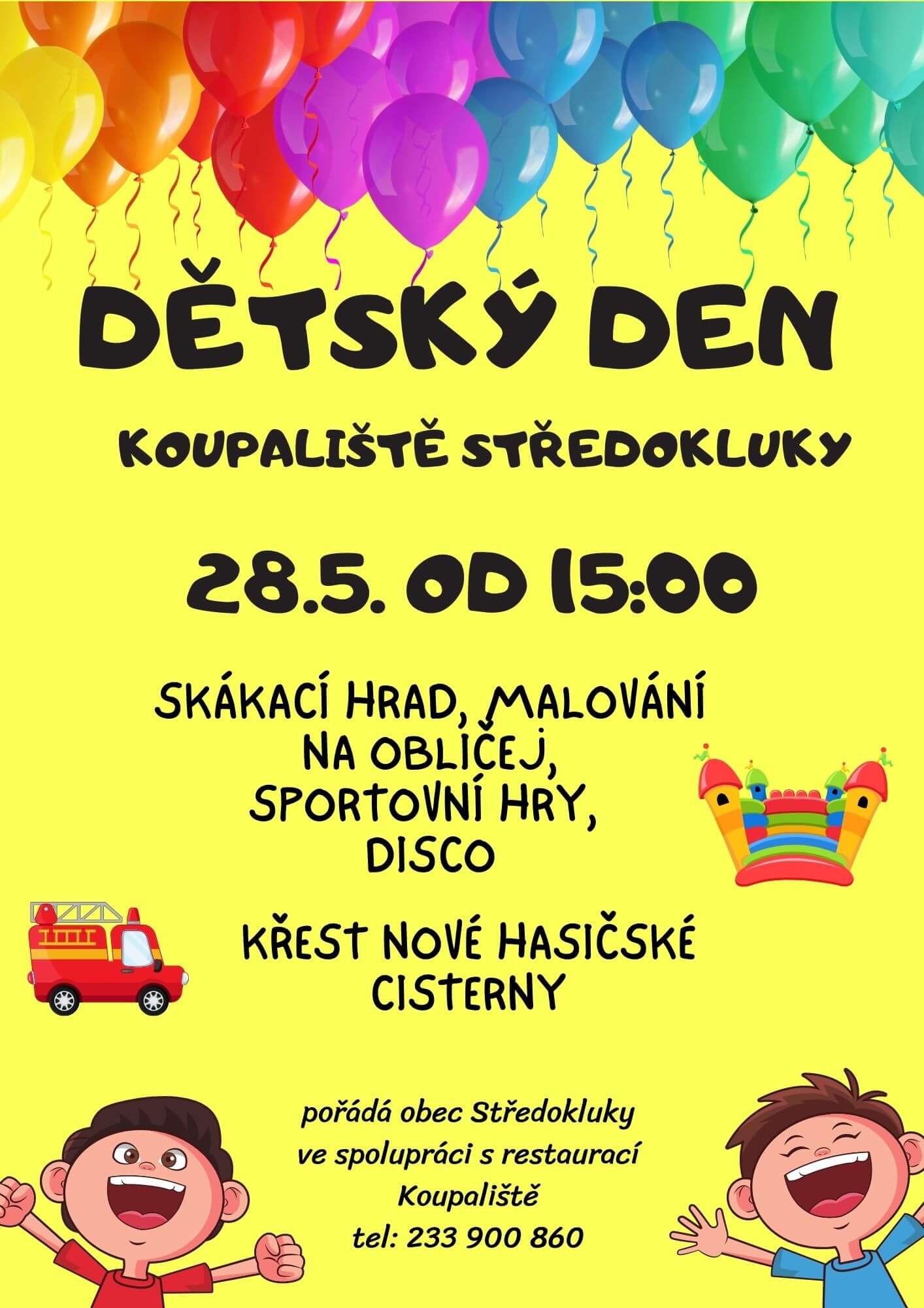 vezměte v sobotu 28. května celou rodinu a přijďte si od 15. hodin užít dětský den na koupališti ve Středoklukách.