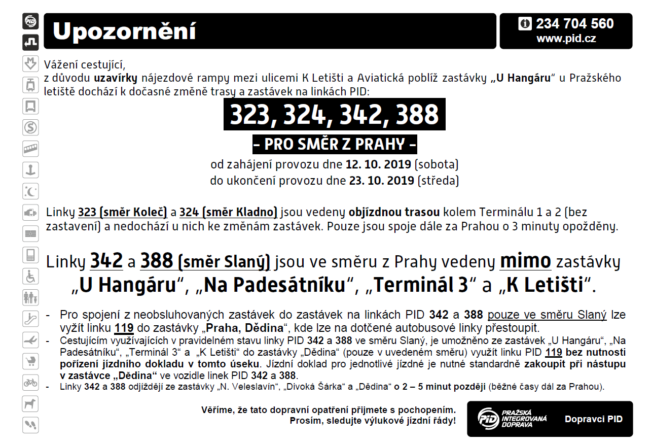 z důvodu uzavírky nájezdové rampy mezi ulicemi K Letišti a Aviatická poblíž zastávky „U Hangáru“ u Pražského letiště dochází k dočasné změně trasy a zastávek na linkách PID: