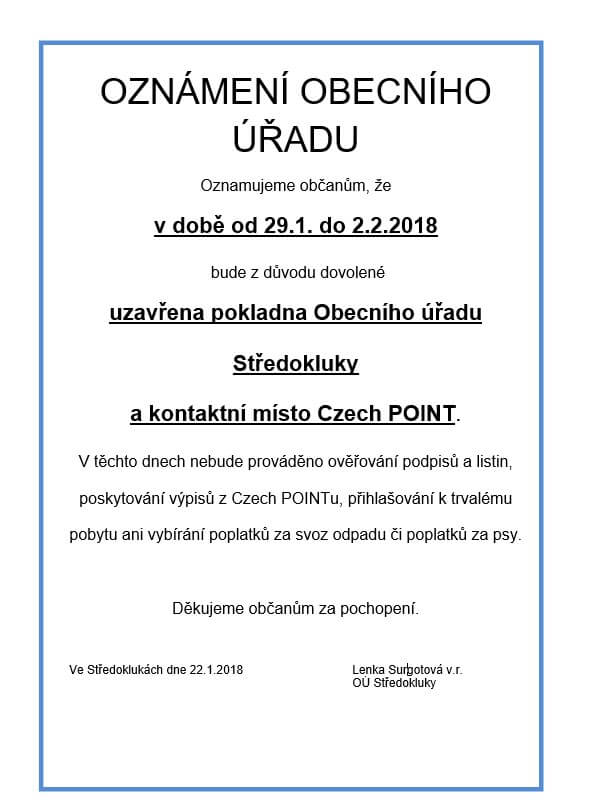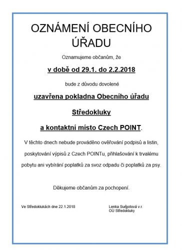 Oznamujeme občanům, že v době od 29. 1. do 2. 2. 2018 bude z důvodu dovolené uzavřena pokladna obecního úřadu a kontaktní místo Czech POINT.