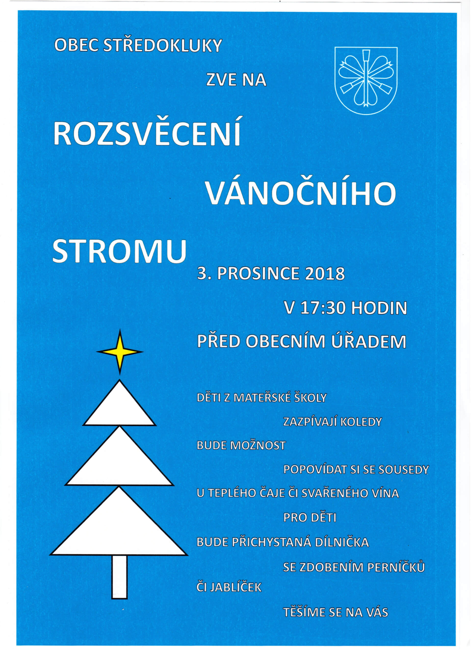 Obec Středokluky zve na „Rozsvěcení vánočního stromu“. Těšit se můžete na zpěv dětí z Mateřské školy, teplý čaj či svařené víno a pro děti nebude chybět dílnička se zdobením perníčků a jablíček.