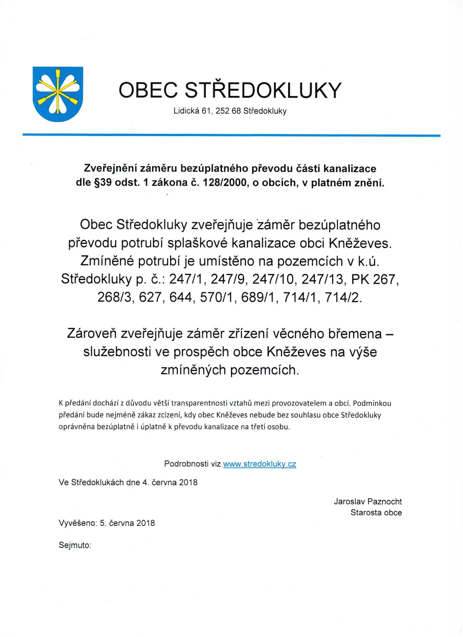 Je přílohou ke článku "Zveřejnění záměru bezúplatného převodu části kanalizace"